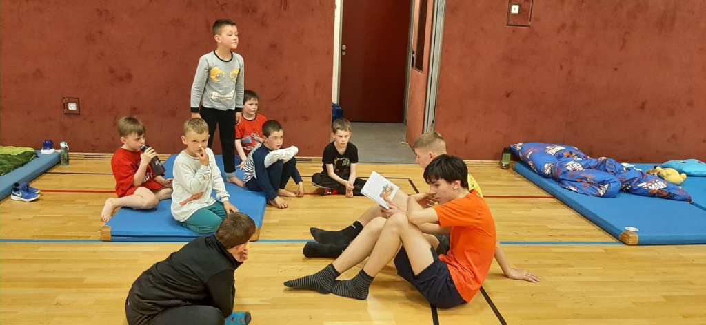 Bevor um circa 20:30 Uhr die Nachtruhe beginnen sollte, lasen unsere drei Helfer Hanna, Paul und Tim den Jungs und Mädchen noch eine Geschichte zum Einschlafen vor. Bis alle Kinder schlummerten, dauerte es allerdings noch eine Weile.