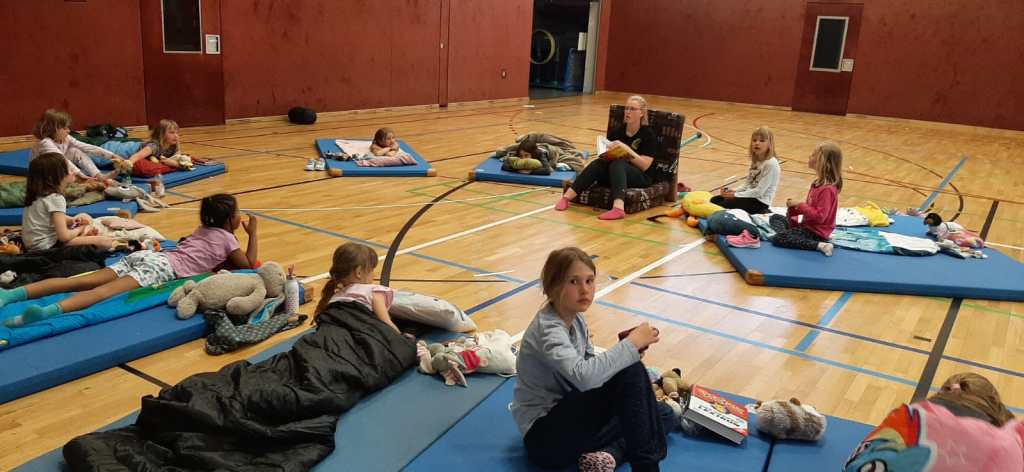 Nach Anreise und einer ersten Trainingseinheit folgte direkt der Aufbau des Nachtlagers in der Sporthalle. Jedes der 19 Kinder bekam eine Matte und durfte diese mit Kuscheltieren und Schlafsack ausstatten.