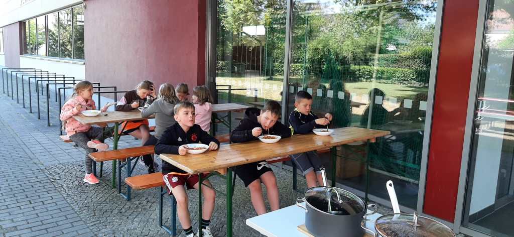 Der Tag begann direkt mit dem morgentlichen Frühsport auf dem Außenplatz hinter der Turnhalle, sodass die Eltern inzwischen das Frühstück vorbereiten konnten.