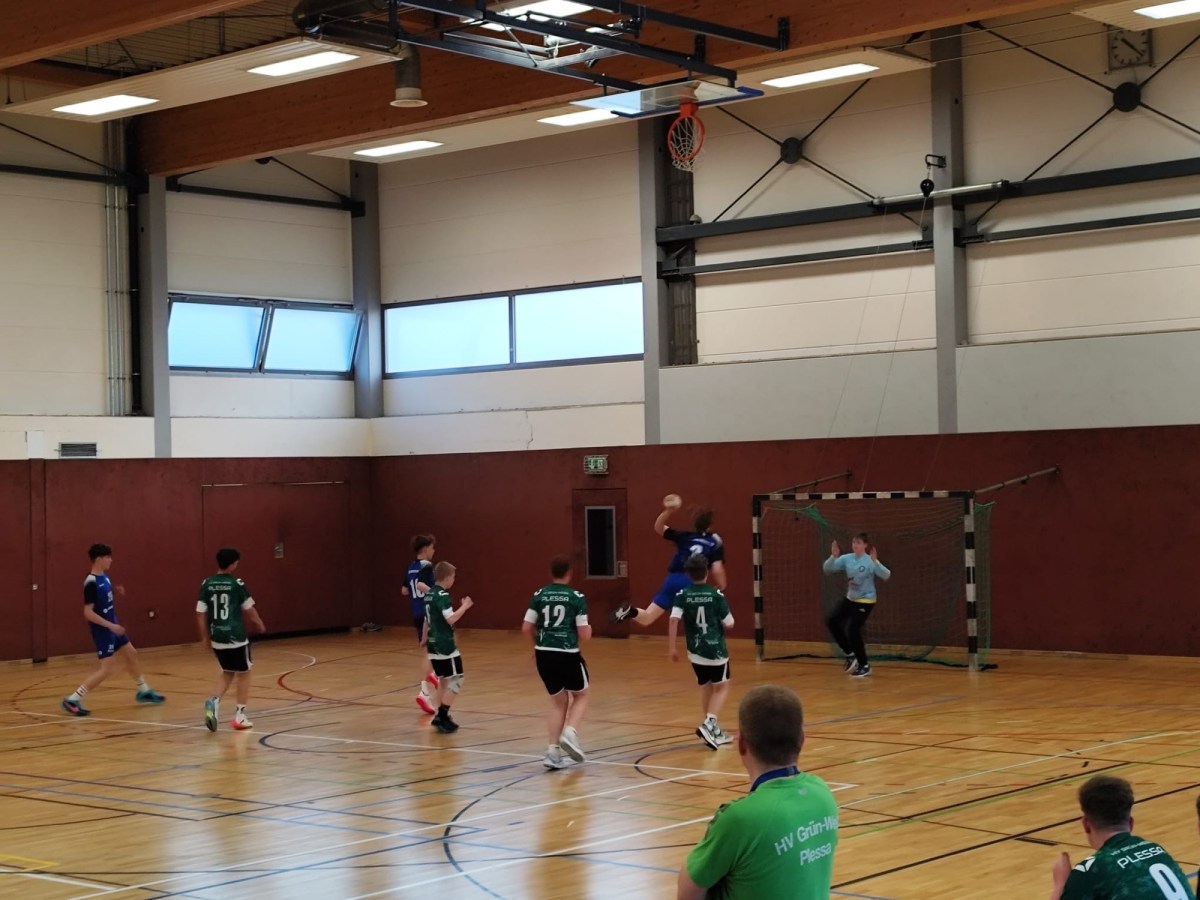 Unsere Jungs kamen gut ins Spiel und zeigten sich hellwach in der Abwehr und blitzschnell im Gegenstoß, so dass es nach 4 Minuten bereits 4:1 aus unserer Sicht stand. Kam doch mal ein Ball aufs Tor, unser gut aufgelegter Torhüter Vincent zur Stelle und entschärfte die Würfe der Plessaer. Bis zur 15. Minute konnten wir die Führung auf 10:4 aufbauen. Dann schlichen sich aber einige Nachlässigkeiten ein und die Gäste konnten sich wieder heranarbeiten. Nach einer Auszeit stellten wir diese aber ab und konnten bis zur Halbzeit den Vorsprung auf 17:11 ausbauen.